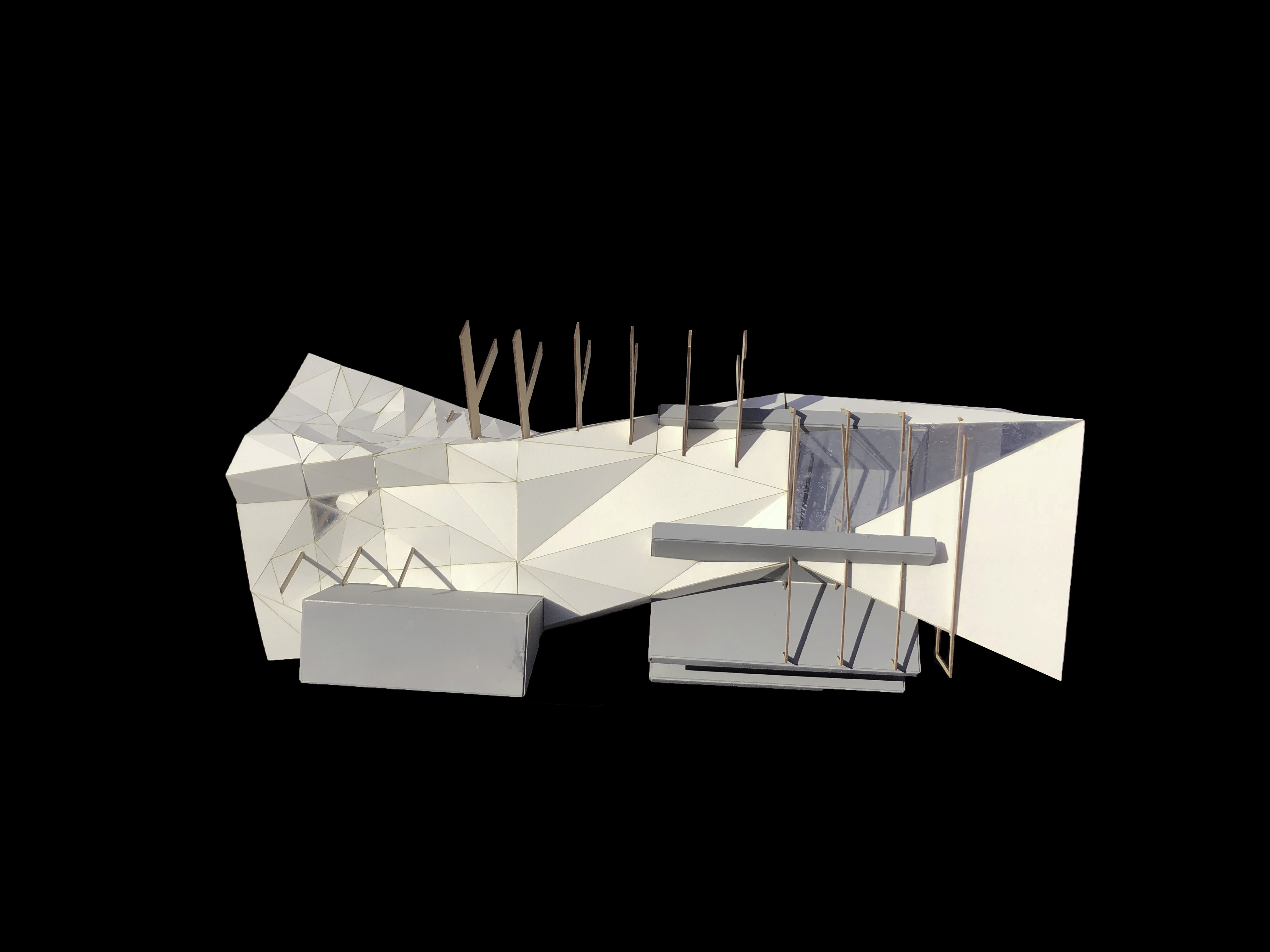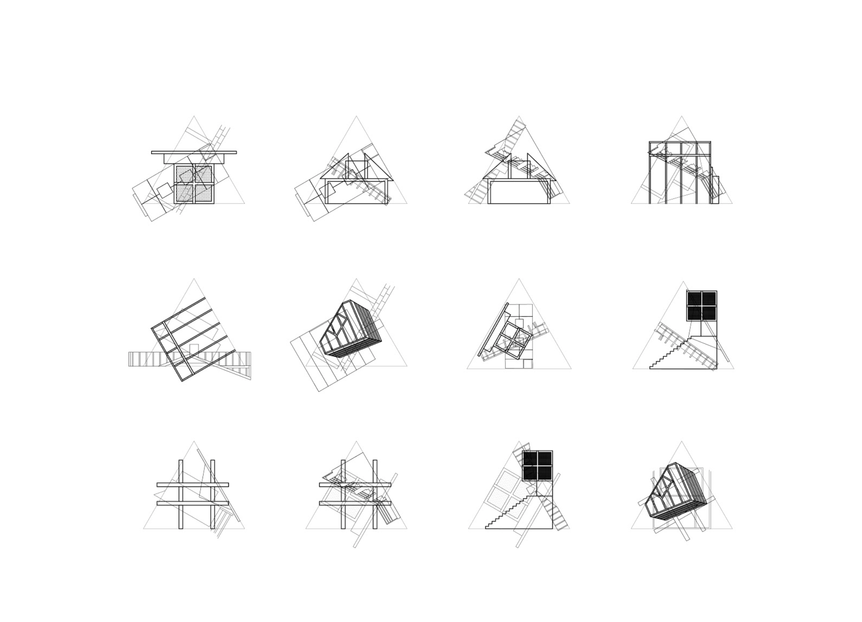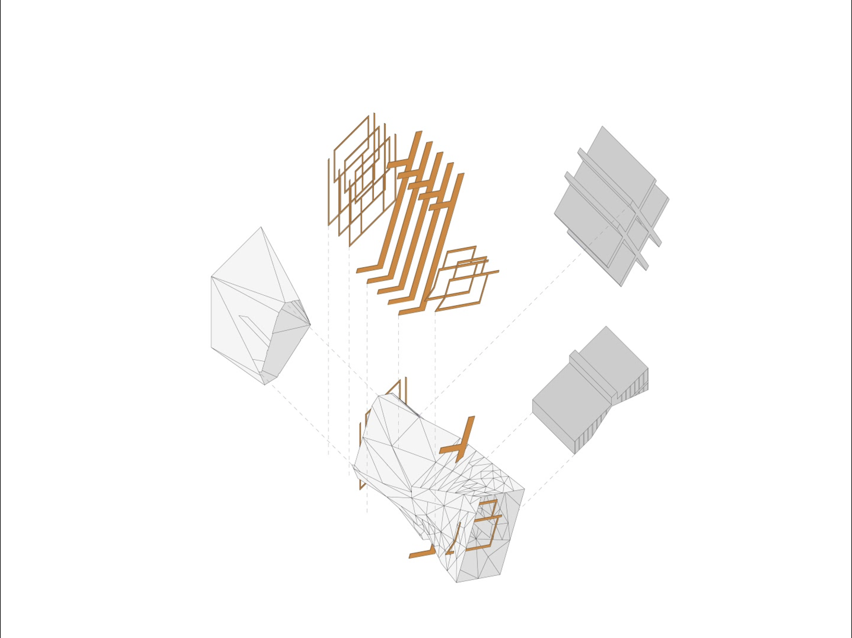 Defragmentation means to, “reorganize separated fragments of related data on into a contiguous arrangement” according to the Merriam Webster Dictionary. This term is used in the context of computing but we applied it to the context of architecture by choosing elements from references (houses by the LA Ten including the Petal House by Eric O. Moss and the Gehry Residence by Frank Gehry). We then classified and overlaid these elements around a triangle to form graphic compositions, and from these we proceeded to use them as section cuts to form a larger 3D object with architectural qualities—or an “architecton.” The transition from 2D to 3D was handled in different ways through lofting, extrusions, and arrays.