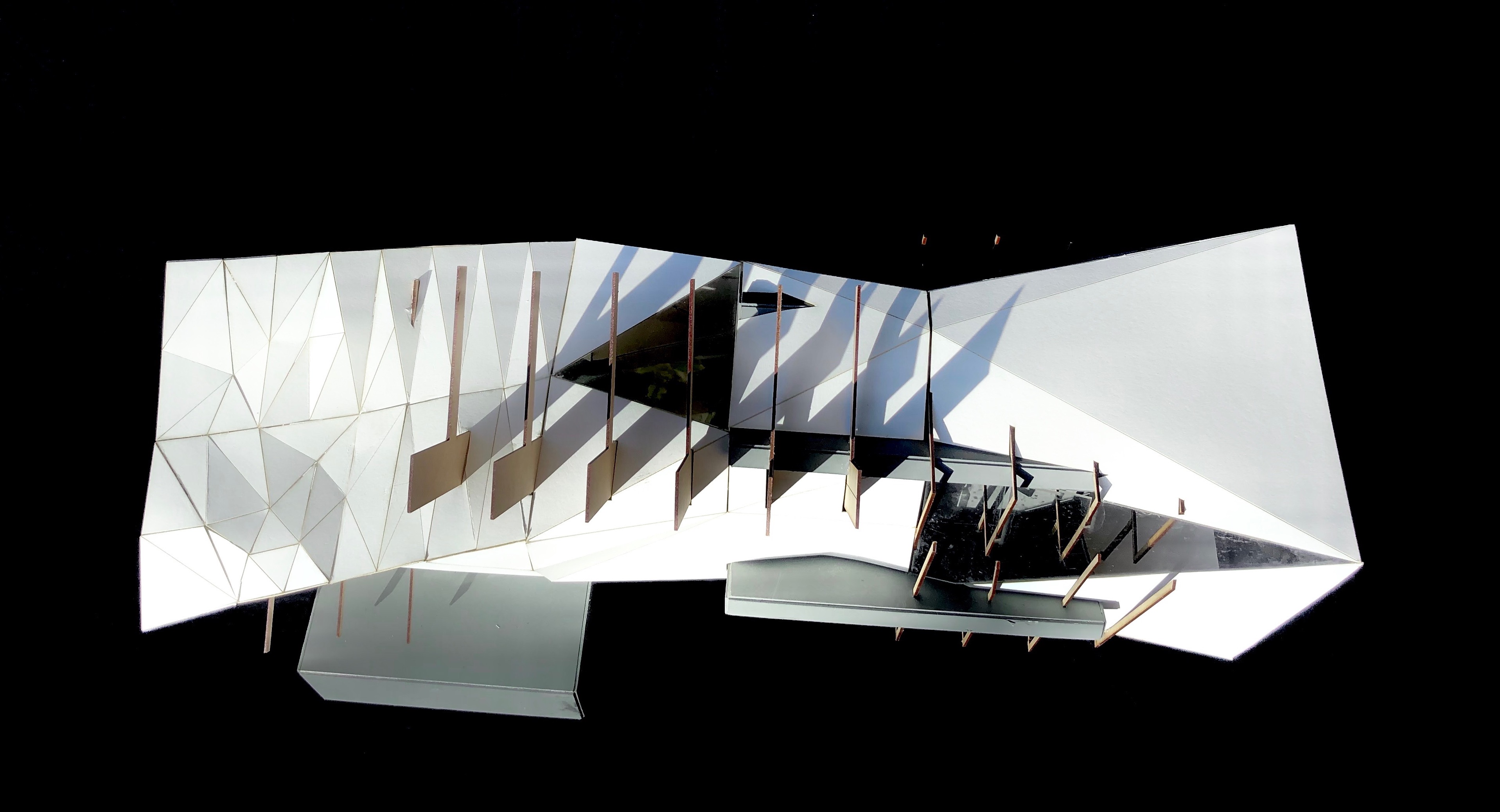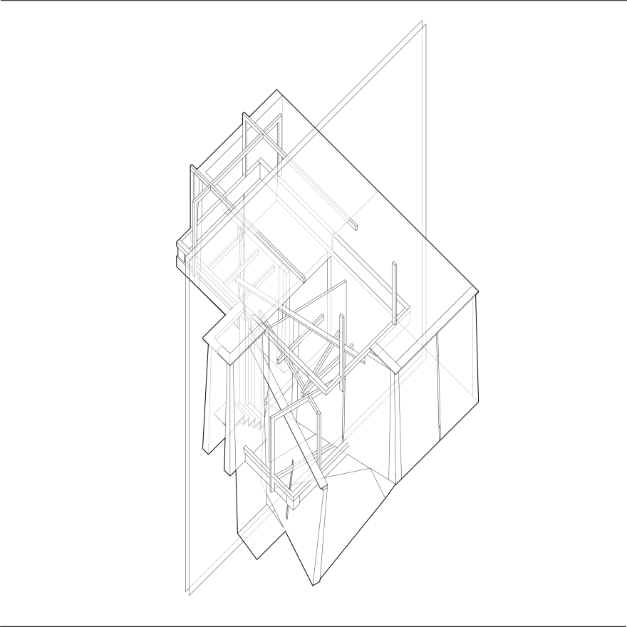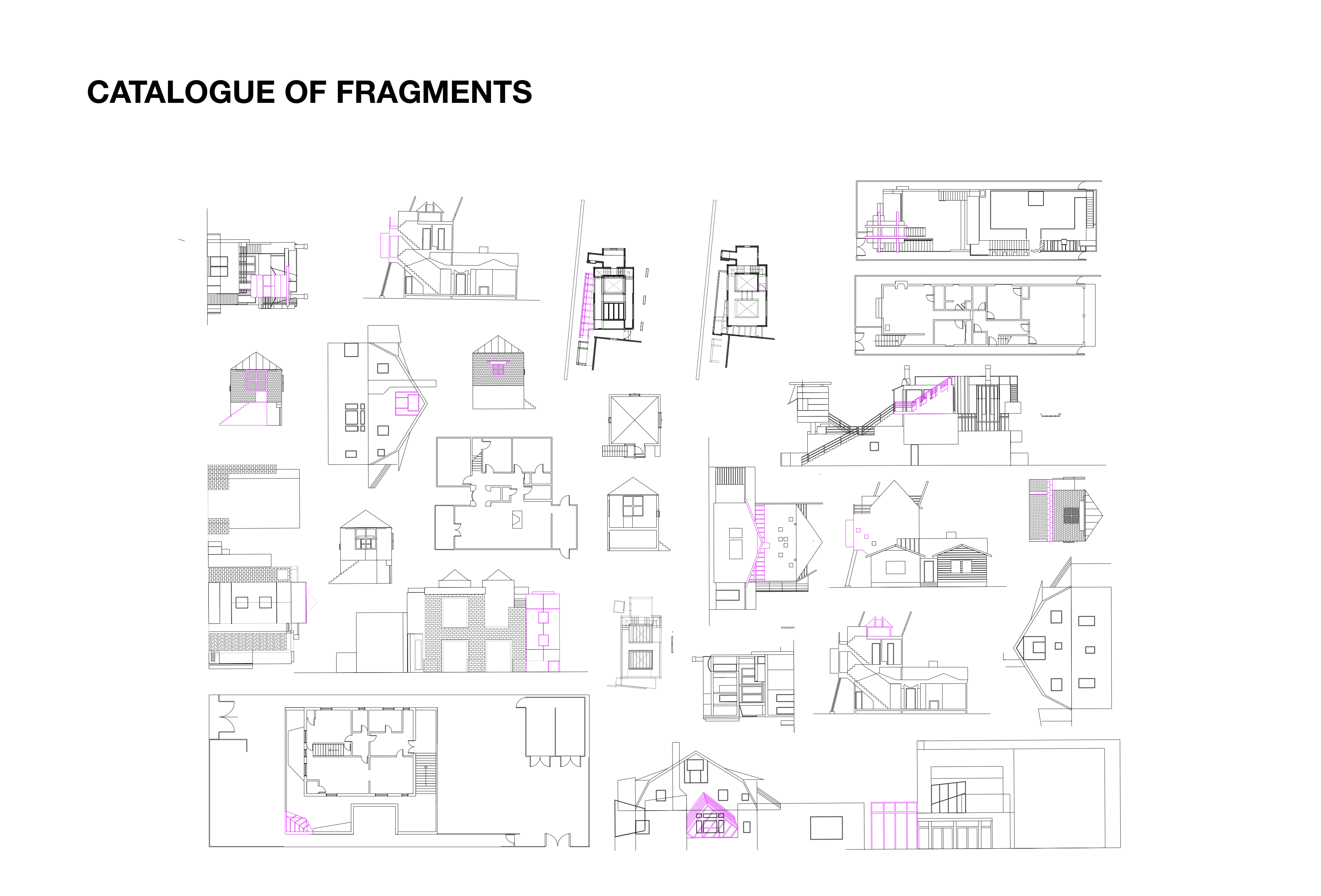 Defragmentation means to, “reorganize separated fragments of related data on into a contiguous arrangement” according to the Merriam Webster Dictionary. This term is used in the context of computing but we applied it to the context of architecture by choosing elements from references (houses by the LA Ten including the Petal House by Eric O. Moss and the Gehry Residence by Frank Gehry). We then classified and overlaid these elements around a triangle to form graphic compositions, and from these we proceeded to use them as section cuts to form a larger 3D object with architectural qualities—or an “architecton.” The transition from 2D to 3D was handled in different ways through lofting, extrusions, and arrays.