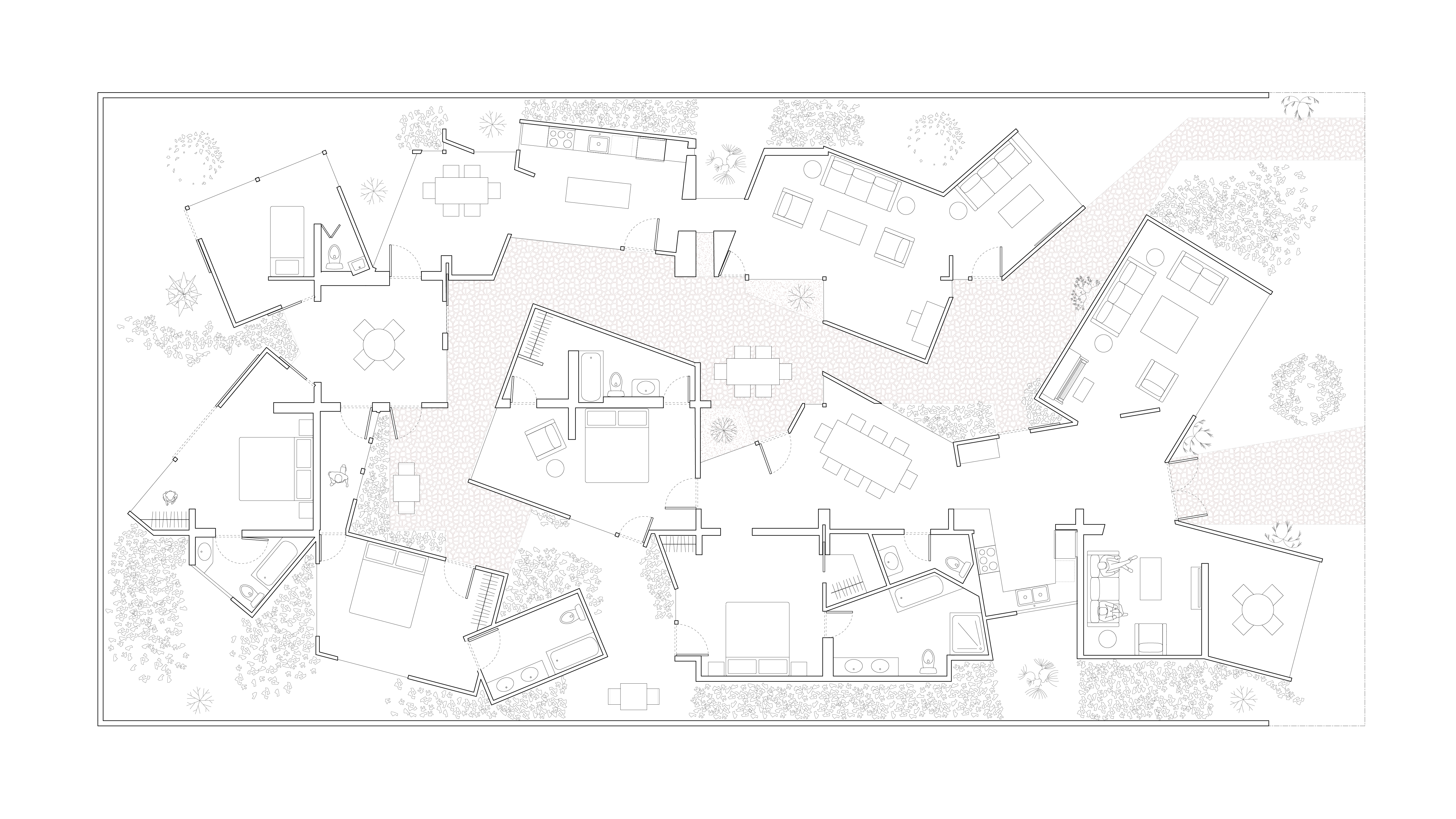 This project focused on the issue of the single-family plot in Los Angeles. As a design challenged, the plot was turned into a single story duplex, with two families inhabiting the same property. A narrative was developed from which the design responds. The plan was initially developed by collaging and altering two reference plans: the Meri House by Pezo von Ellrichshausen and the Moriyama House by SANAA. As the project turned 3D, the roof design was created by using vernacular gables and cutting through them with the perimeter of the plan, with the roofs inverted depending on which family the house belongs to. A wrap-around wooden slat material was applied to the project as a whole, with windows showing the sectional quality of the model.
