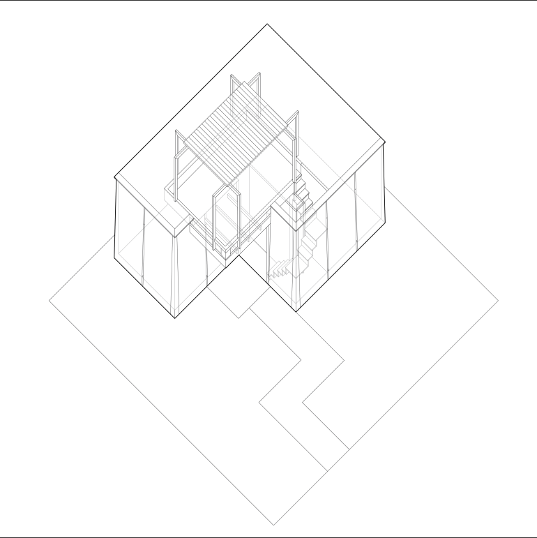 These axonometric projections are drawings created from this digital model in which all 90° angles are at 45° from the vertical axis. Therefore, there is no perspective in these drawings, and all objects have a directly measurable size since they are not altered by how far they are from the “camera” since there is no such focal point. It’s as if one was looking at the object from an infinite distance with an infinite zoom. This creates somewhat of a confusing effect, since it’s often hard to tell apart directions and relationships in distance and altitude. By using this type of projection, what one knows becomes strange, since this type of drawing cannot exist in reality.
